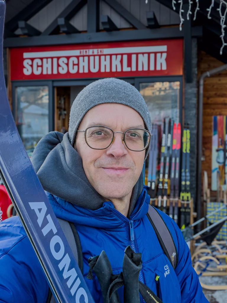 Dann der Morgen: Der erste Eindruck im Hellen von Filzmoos: klare Bergluft, Blick auf Dachstein und Bischofsmütze, überschaubares Zentrum. Kein hektisches Gedränge, sondern ein Dorf, das entschleunigt. Nach dem Frühstück im Hotel Auszeit Filzmoos beginnt der Wintertag idealerweise aktiv – mit einer kurzen Warm-up-Runde auf einer der Anfängerloipen in Hotelnähe. Die entsprechende Skiausrüstung habe ich mir in dem Fall von Sport Stefan geholt, inklusive Anpassung an meine Größe etc. Dann die ersten kleinen Runden 100 m Luftlinien vom Hotel. Perfekt, um wieder ins Gefühl zu kommen, ohne Druck.