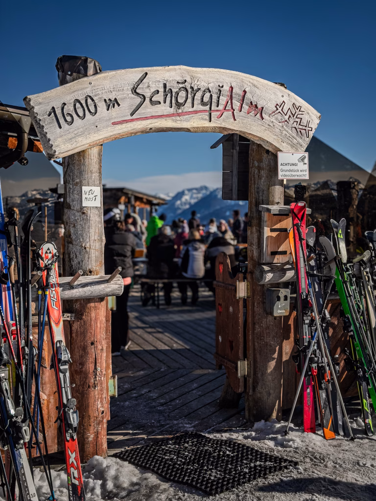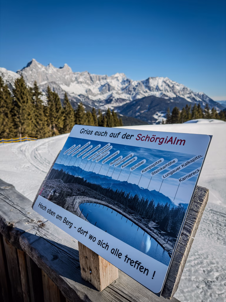 Oben öffnet sich der Blick auf das Dachsteinmassiv – ein Panorama, das den Ort prägt. Wer mag, kehrt in der Schörgi Alm ein: klassische Alpenküche, große Fenster, Sonne auf der Terrasse.