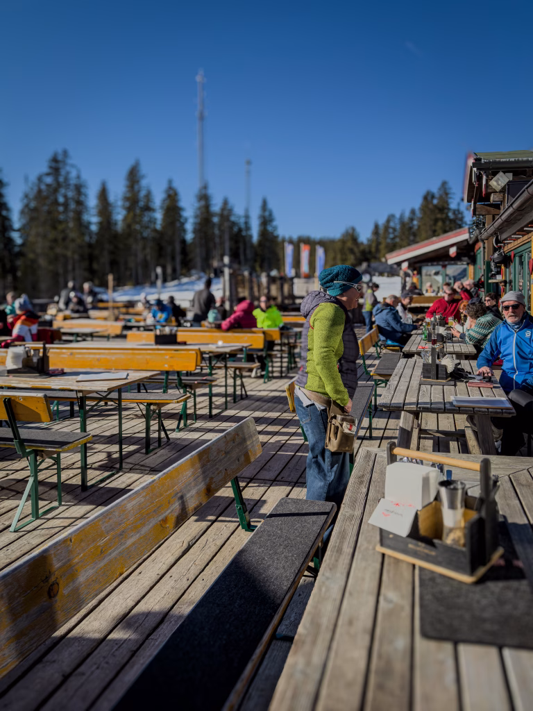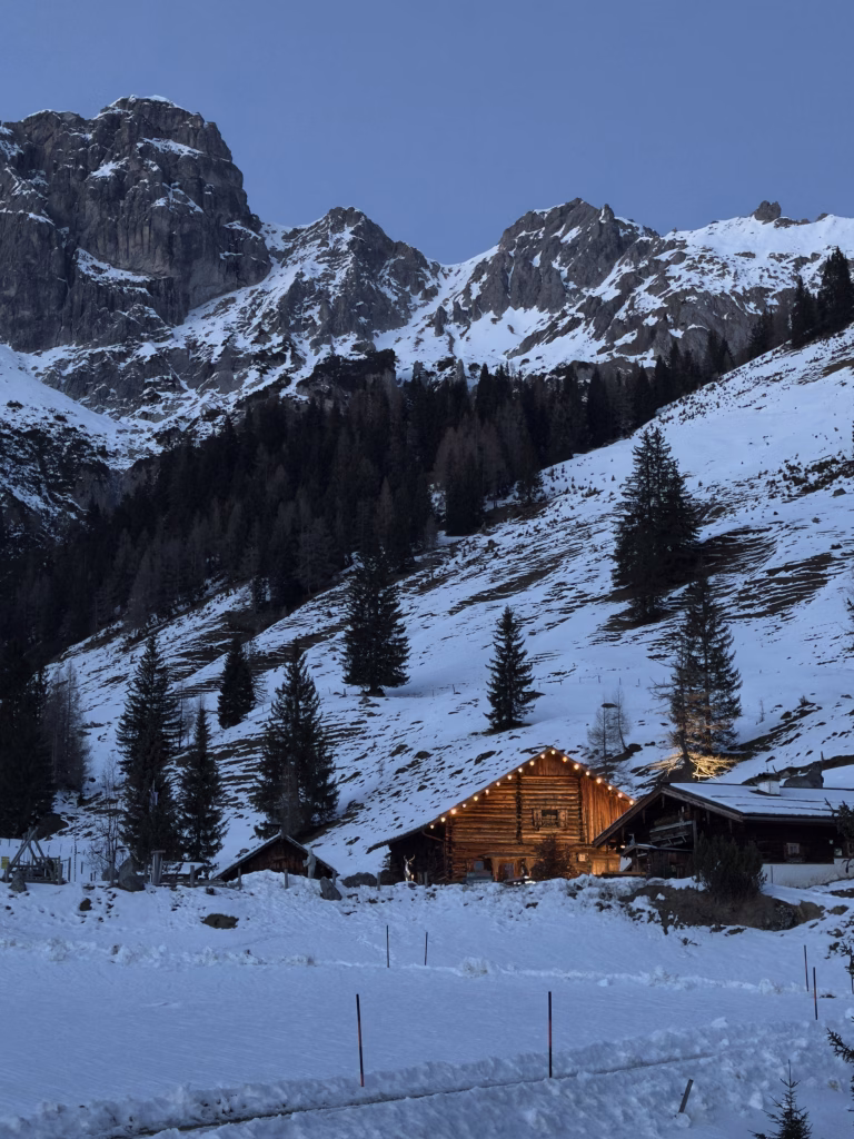 Oben wartet alpine Kulinarik unter mächtigen Gipfeln. Hier wird Winter greifbar – nicht als Action, sondern als Atmosphäre.