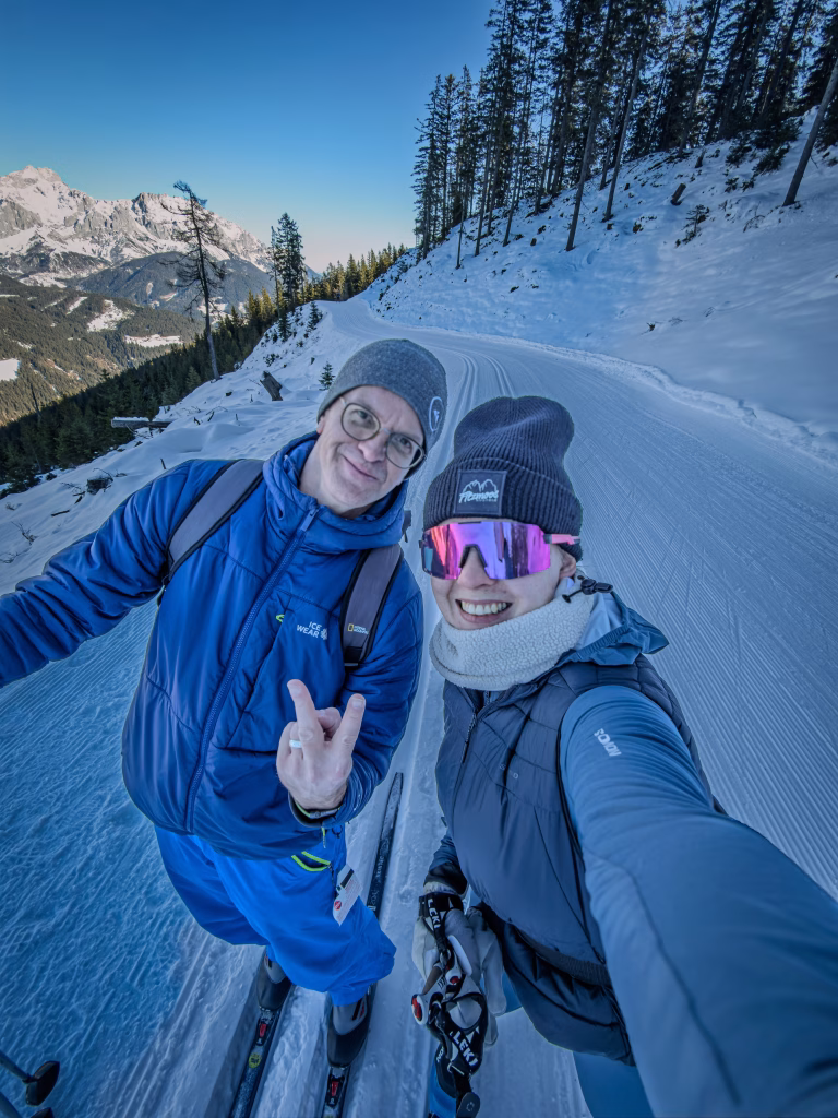 Am Nachmittag wird es sportlich – ein geführter Langlaufkurs auf der Höhenloipe Rossbrand. Gerade mit Guide merkt man schnell, wie viel Technik im „einfachen Gleiten“ steckt. Filzmoos bietet über 50 Kilometer Loipen und gilt als schneesicher – ein echter Pluspunkt. Und die Höhenloipe toppt alles. Der Blick auf Bischofsmützen und Dachstein ist atemberaubend.