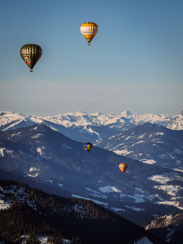 Der zweite Tag beginnt spektakulär am frühen Morgen, es ist bitterkalt und glasklare Luft: Heißluftballonfahrt über den Alpen. Filzmoos ist international bekannt für sein Ballongebiet. Wenn der Korb langsam steigt und Dachstein sowie Bischofsmütze unter dir auftauchen, wird klar, warum dieses Erlebnis als Markenzeichen des Ortes gilt. Es ist still da oben – fast surreal. Genau diese Mischung aus Weite und Ruhe macht den Moment besonders.
