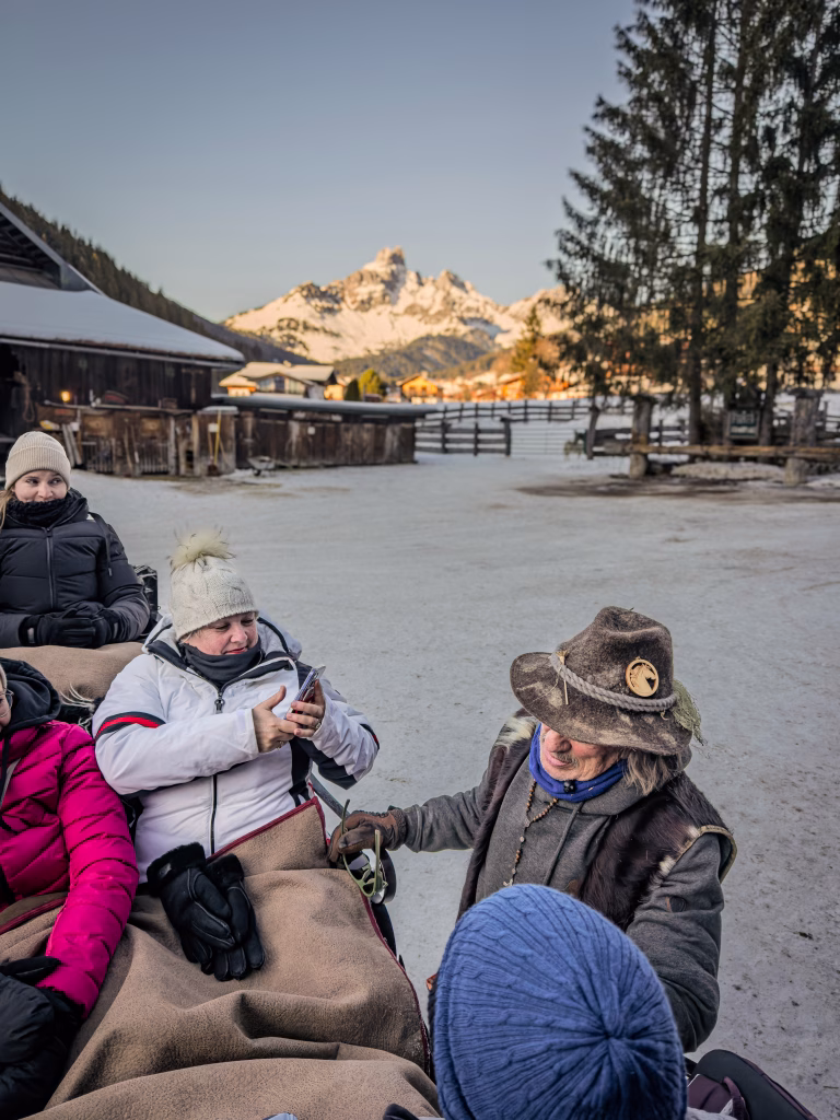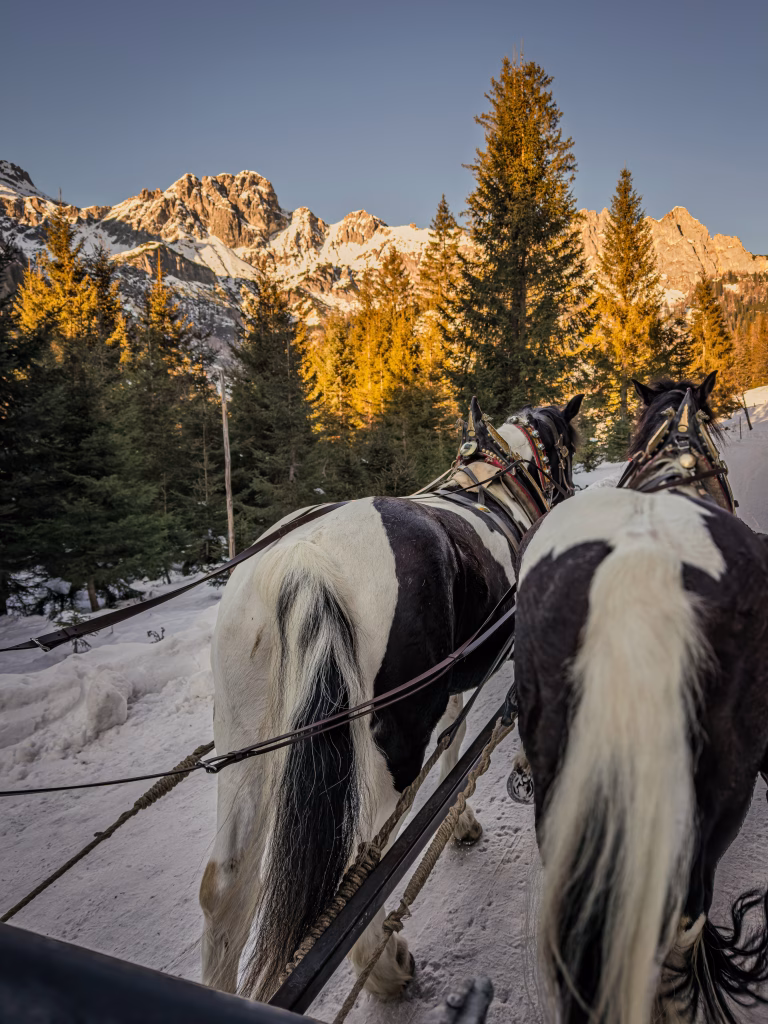 Am Nachmittag folgt ein Kontrast, der perfekt passt: Pferdeschlittenfahrt zur Oberhofalm. Der Weg führt durch verschneite Landschaft, begleitet vom gleichmäßigen Klang der Hufe.